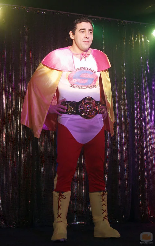 Amador (Pablo Chiapella) se pone un traje de superhéroe para trabajar como stripper en 'El capitán salami, un cura en peligro y una diosa de la fertilidad' de 'La que se avecina'.