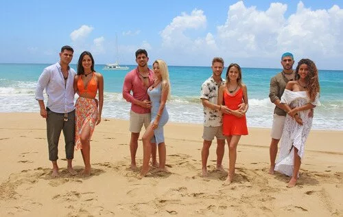 Foto grupal de Alejandro Nieto y Tania Medina, Darío Sellés y Sandra Férriz, Nico Aubert y Gal·la Mora, además de Josué Bernal y Zoe Mba. Las cuatro parejas participantes de 'La isla de las tentaciones 4' no conocían la existencia de otros dos compañeros en el reality de Telecinco y Cuarzo Producciones.