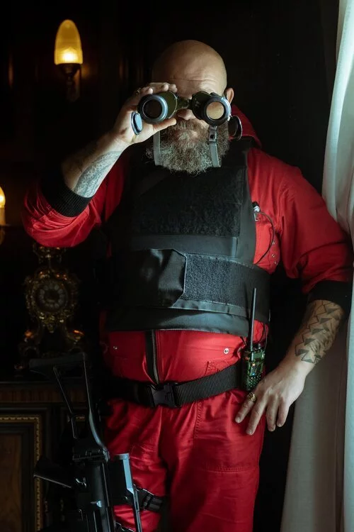 Darko Peric mira a través de unos prismáticos en 'La Casa de Papel', el fenómeno de acción producido y distribuido por Netflix.