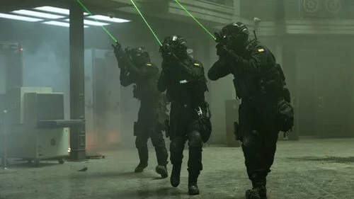 Tres agentes de las fuerzas del orden caminan sobre las cenizas de la guerra desatada en el Banco de España durante la serie de Netflix.
