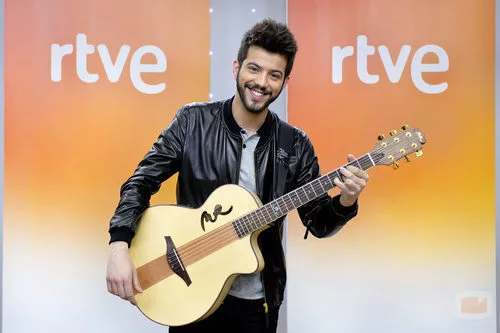 El cantante, que posa con su inseparable guitarra, estuvo presente en la presentación de la gala de preselección en TVE.