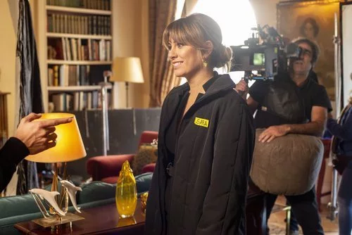 La popular actriz recibe indicaciones de la directora mientras lleva un chaqueta con el nombre de su personaje pegado: Sara.