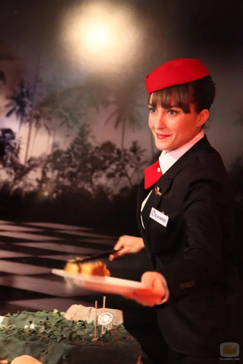 Una azafata de Oceanic reparte tarta durante la inauguración de la exposición.