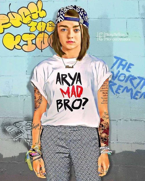 Arya, interpretada por Maisie Williams, en un dibujo obra de Hilary Heffron en el que aparece con tatuajes identificativos del personaje y una camiseta con su nombre con un entorno relacionado con el rap.