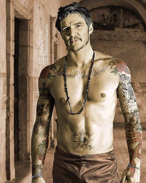 Oberyn Martell (Pedro Pascal) de 'Juego de Tronos' caracterizado con tatuajes que muestran sus señas de identidad, obra de la artista Hilary Heffron de Hilarious Delusions.