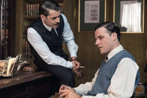 (1x01) Antonio Montejano y Rafael Figueroa conversan, serios, en el primer episodio de la serie de RTVE 'La sonata del silencio'.