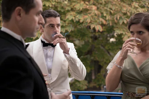 (1x01) Rafael Figueroa, un reputado notario que da vida el actor Eduardo Noriega, fumando en un evento social en el primer episodio de 'La sonata del silencio'.