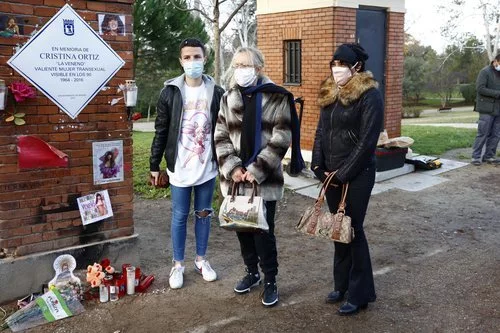 Juani Ruiz, una de las actrices de 'Veneno' y amiga de Cristina Ortiz, junto a otros allegados homenajean a la vedette fallecida en 2016 en la reposición de su placa en el Parque del Oeste.
