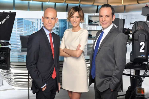 El presentador de los Deportes (izquierda) y los conductores de la edición matinal de Informativos Telecinco (derecha).