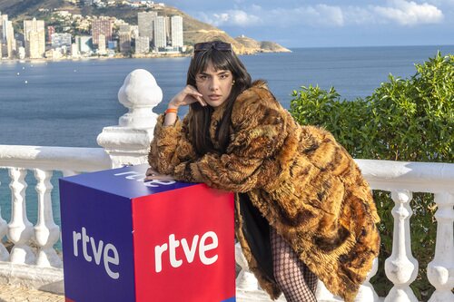 La intérprete de "Sigues en mi mente, Marta Sango, posando en la rueda de prensa de la Semifinal 2 del Benidorm Fest.