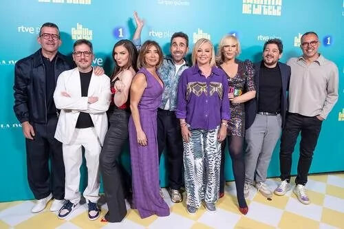 Presentadores, directivos de RTVE y de La Osa posan en la presentación de 'La familia de la tele'