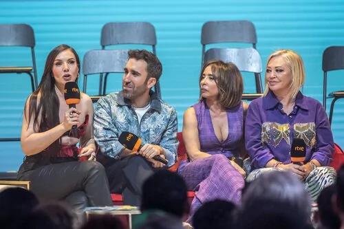 Inés Hernand, Aitor Albizua, María Patiño y Belén Esteban presentan 'La familia de la tele' ante las personas reunidas en la rueda de prensa.