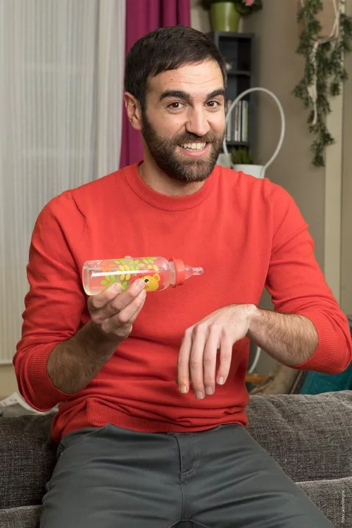 Jon Plazaola posa con el biberón de su hija en la cuarta temporada de 'Allí abajo'