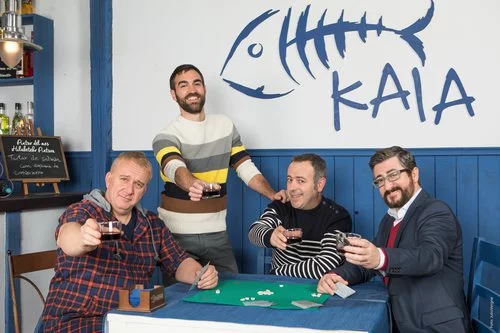 Iñaki, Antxon, Koldo y Sabino bebiendo vino en una mesa del restaurante Kaia en la cuarta temporada de la ficción de Antena 3.