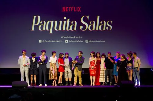 El equipo de 'Paquita Salas' subido sobre el escenario de la premiere de la segunda temporada de la serie de Netflix.