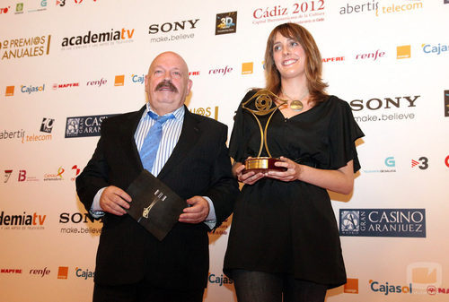 José María Íñigo entrega a la coordinadora de guiones de 'Buenafuente' el premio AcademiaTV 2010 al mejor guión.