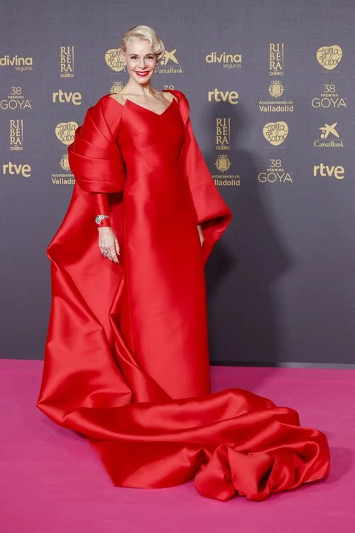 La actriz Belén Rueda luce su vestido rojo ante los medios antes de que dé comienzo la gran cita de los Premios Goya en Valladolid.