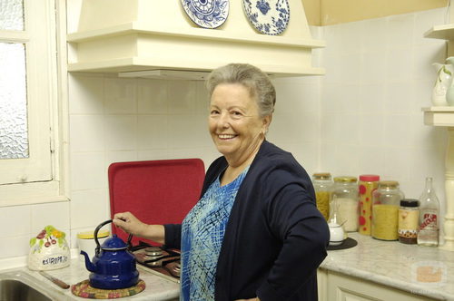 María Galiana posa para los fotógrafos en la cocina de la casa de Herminia del barrio de Salamanca.