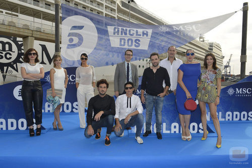 Los actores de la serie 'Anclados' posan ante la prensa frente a un crucero en el puerto de Valencia.