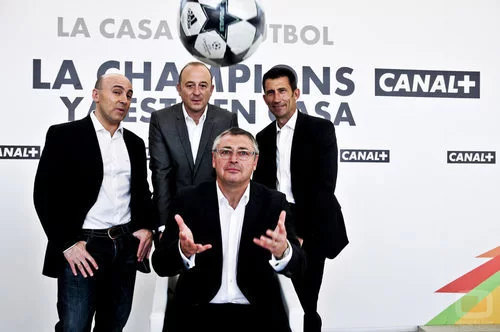 Michael Robinson "escoltado" por Maldini, Nacho Aranda y Carlos Martínez en la presentación de la Champions de Canal+.
