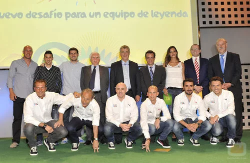 El equipo de periodistas del Área de Deportes de Mediaset España, presidido por J.J. Santos, posan en el Salón de Actos de la Ciudad del Fútbol de Las Rozas junto con Pepe Reina, David Villa, Iker Casillas, Paolo Vasile, Ángel Mª Villar y Vicente del Bosque.