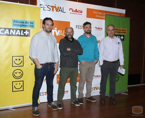 Jorge Ortíz (subdirector de programas de Canal+), Javier Cansado (humorista), Álex Mendibil (guionista) y Miguel Salvat (director de Canal+).
