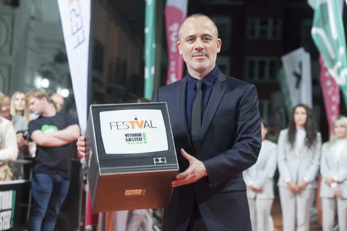 El actor Javier Gutiérrez posa con el símbolo de la televisión del FesTVal Vitoria-Gasteiz en el estreno de 'Estoy vivo'.