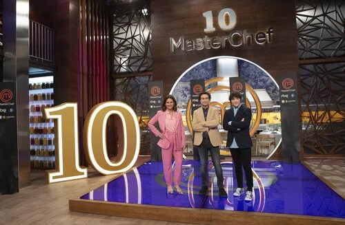 Samantha Vallejo-Nágera, Jordi Cruz Mas y Pepe Rodríguez, posando en la presentación de 'MasterChef 10' desde el plató.