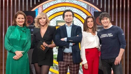 Macarena Rey, CEO de Shine Iberia, y María Eizaguirre, directora de comunicación de RTVE, posan junto con el jurado de 'MasterChef 11', formado por Pepe Rodríguez, Jordi Cruz y Samantha Vallejo-Nágera.