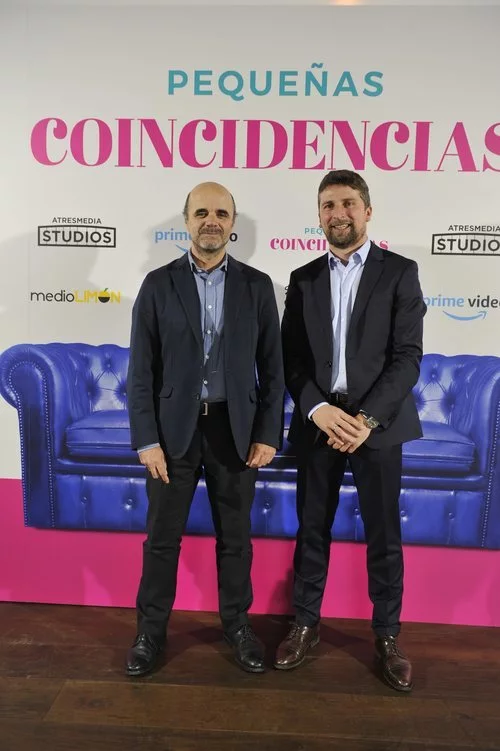 Ignacio Corrales, Director General de Atresmedia Studios, y Ricardo Carbonero, directivo de Amazon España, posan conjuntamente en la presentación de 'Pequeñas coincidencias', la serie que sus dos medios coproducen.