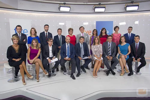 El director de TVE, Ignacio Corrales, y el de los Servicios Informativos, Julio Somoano, junto a los presentadores de esta nueva etapa televisiva.