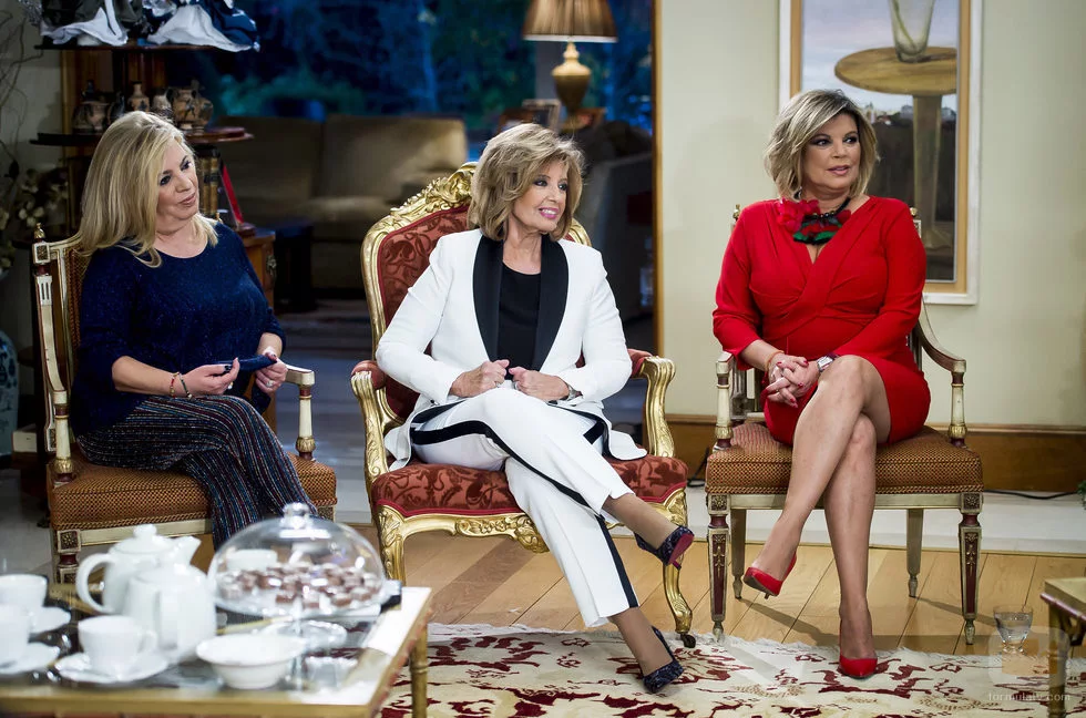 Carmen Borrego, María Teresa Campos y Terelu sentadas juntas en el salón de la casa de Terelu durante la rueda de presa de presentación de la tercera temporada de su docu-reality 'Las Campos'.