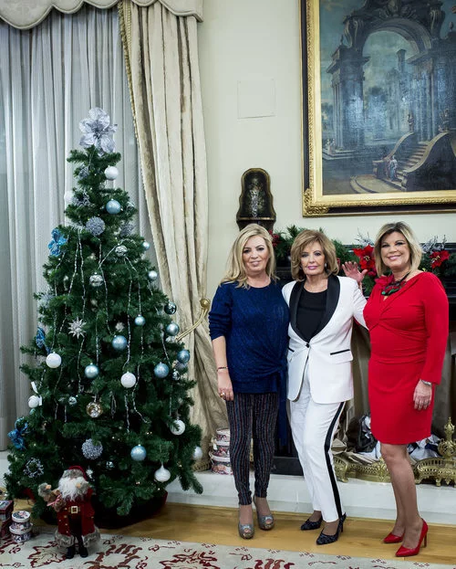 Las tres Campos posan juntas al lado del árbol de Navidad en el salón de la casa de Terelu durante la rueda de prensa de presentación de la tercera temporada de su docu-reality en Telecinco, 'Las Campos'.