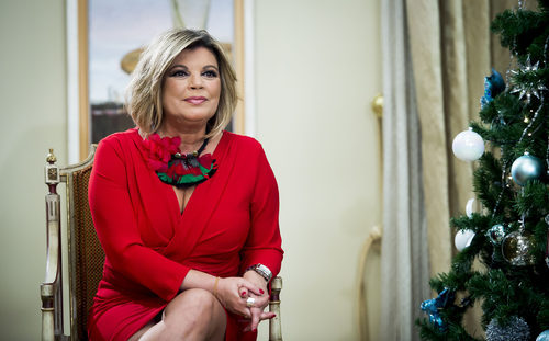 Terelu Campos sentada junto al árbol de Navidad en el salón de su casa durante la rueda de prensa de presentación de la tercera temporada de su reality en Telecinco, 'Las Campos'.
