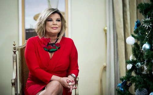 Terelu Campos sentada junto al árbol de Navidad