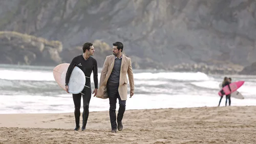 El actor conversa con un surfista al borde del agua para la serie de Antena 3 en tierras vascas, un thriller que sigue la vida de un investigador pesquero.
