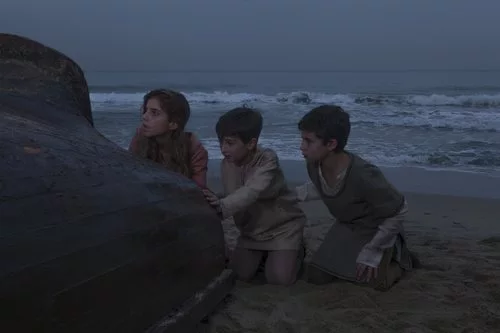 Guiamón, Margarida y Arnau en el primer capítulo de 'La catedral del mar' se esconden detrás de un bote.