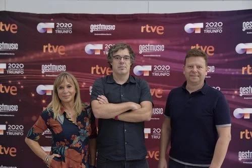 Toñi Prieto (directora de Entretenimiento de TVE), Tinet Rubira (director general de Gestmusic Endemol Shine Group) y Nacho Gómez (director de RTVE Digital e Investigación) en el primer casting de 'OT 2020' en Barcelona.
