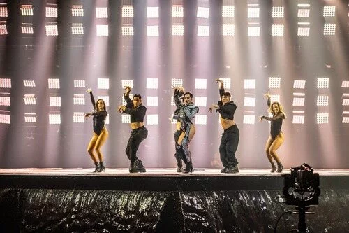 Chanel Terrero, acompañada de sus bailarines, preparando la coreografía de "SloMo" sobre el escenario de Eurovisión 2022 durante el primer ensayo.