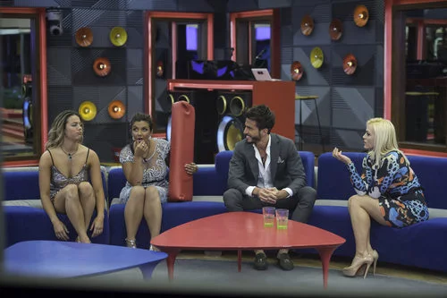 Los concursantes Alyson, Elettra, Marco y Daniela aparecen en esta imagen sentados en el salón de 'Gran Hermano VIP' durante la primera parte de la final del reality.