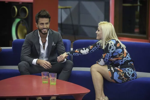 Daniela y Marco, concursantes de 'Gran Hermano VIP 5', se agarran de la mano para soportar los nervios de la primera parte de la final del concurso.