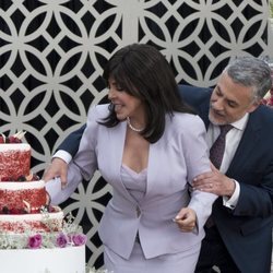 Verónica Castro y Arturo Ríos partiendo la tarta durante una escena de 'La casa de las flores'