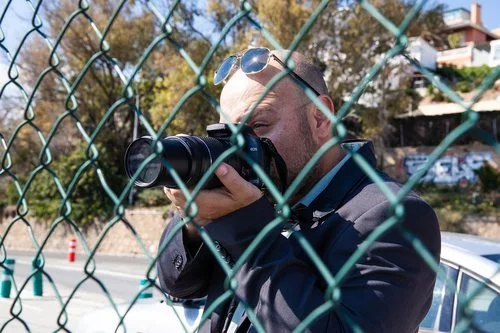 Joaquín Romero "Quino" (Vicente Romero) sacando fotografías en uno de los episodios de 'Malaka', serie de RTVE.