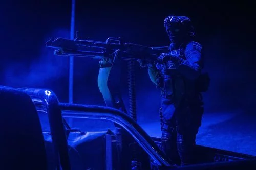 Uno de los abundantes agentes de las fuerzas fascistas controlan el tránsito nocturno en el deteriorado Madrid de 2045.