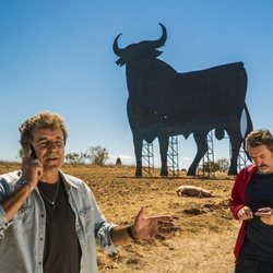 Teo y Pascual delante de un toro de Osborne en la primera temporada de 'Matadero'