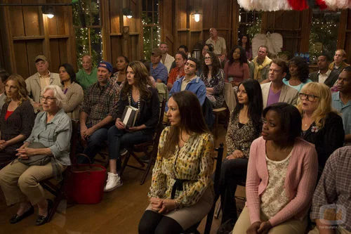 Lorelai (Lauren Graham) y Luke (Scott Patterson) no pueden ocultar su cara de sorpresa en esta reunión de vecinos de Stars Hollow celebrada en el regreso de 'Las chicas Gilmore'.