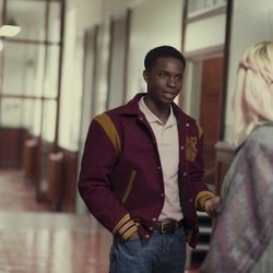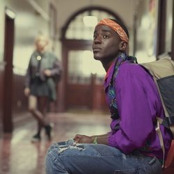 Ncuti Gatwa sentado en el pasillo en 'Sex Education'