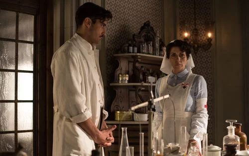 Foto de una de las escenas de la serie de Antena 3 'Tiempos de Guerra' en la que aparece el actor Álex García y la actriz Alicia Borrachero.