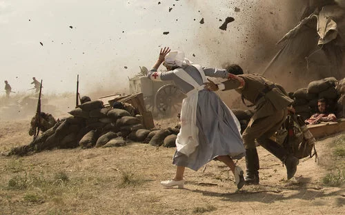 Un soldado y una enfermera intentan cubrirse de una explosión durante la guerra en la serie 'Tiempos de guerra'.