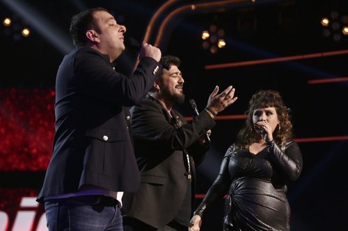 Antonio Orozco, Lia Kali y Javi Moya interpretan "Temblando" en la primera Gala en directo de 'La Voz' en Atena 3.